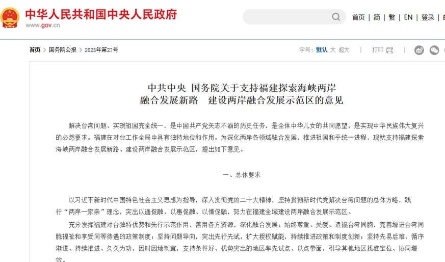 《中共中央 国务院关于支持福建探索海峡两岸融合发展新路建设两岸融合发展示范区的意见》发布实施。